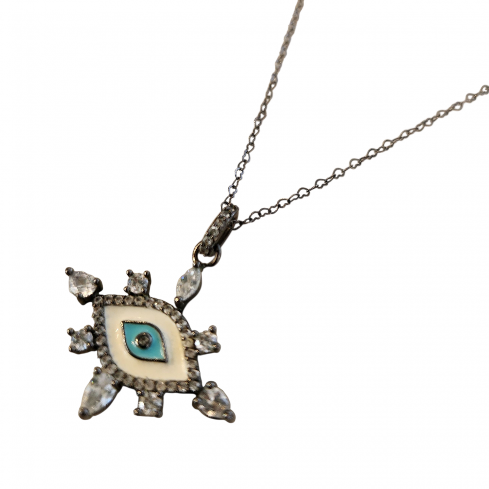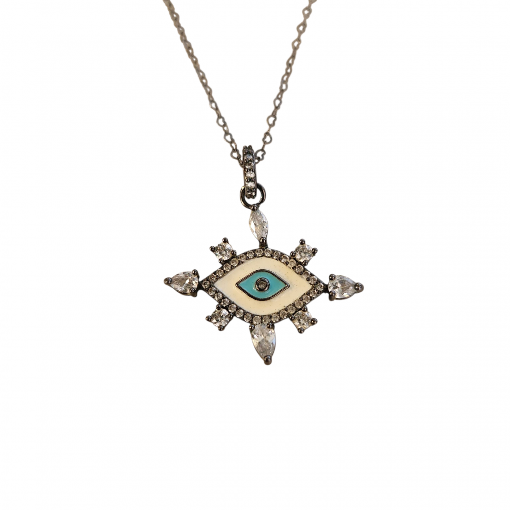 Colar folheado em ródio negro com elos mini corações. Comprimento 36 cm. Pingente olho grego com resina e zirconias cravejadas. Tamanho 2.3 cm x 3 cm. Material antialérgico e garantia de 1 ano.