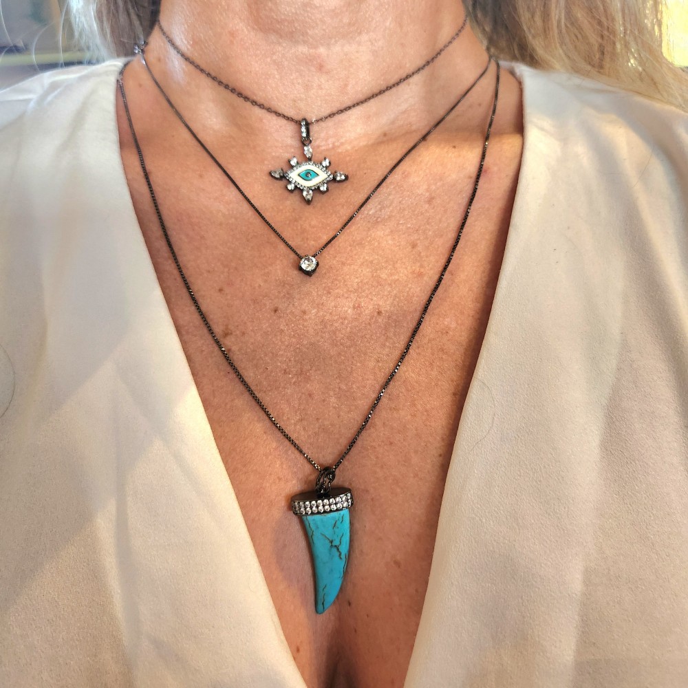 Colar veneziana, 60 cm de comprimento. Pingente pedra turquesa com zirconias cravejadas. Tamanho: 4.3 cm x 2 cm. Semijoias folheadas em ródio negro com zirconias cravejadas. Material antialérgico e garantia de 1 ano.