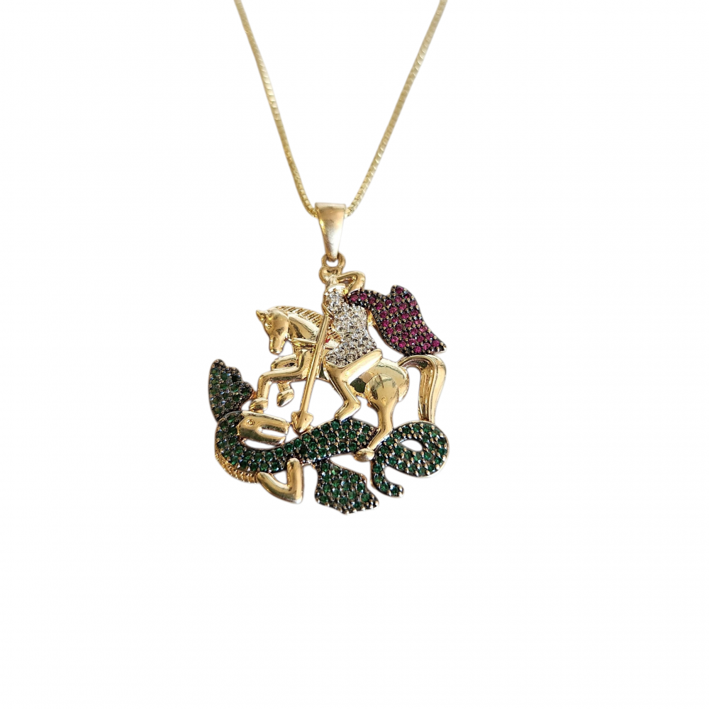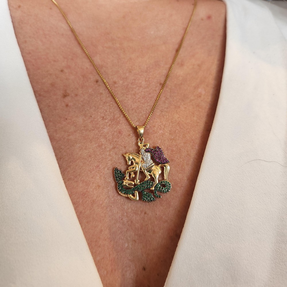 Colar veneziana 45 cm. Pingente 3.5 cm x 2.5 cm. Banho de ouro 18k com zirconias coloridas cravejadas. Material antialérgico e garantia de 1 ano.