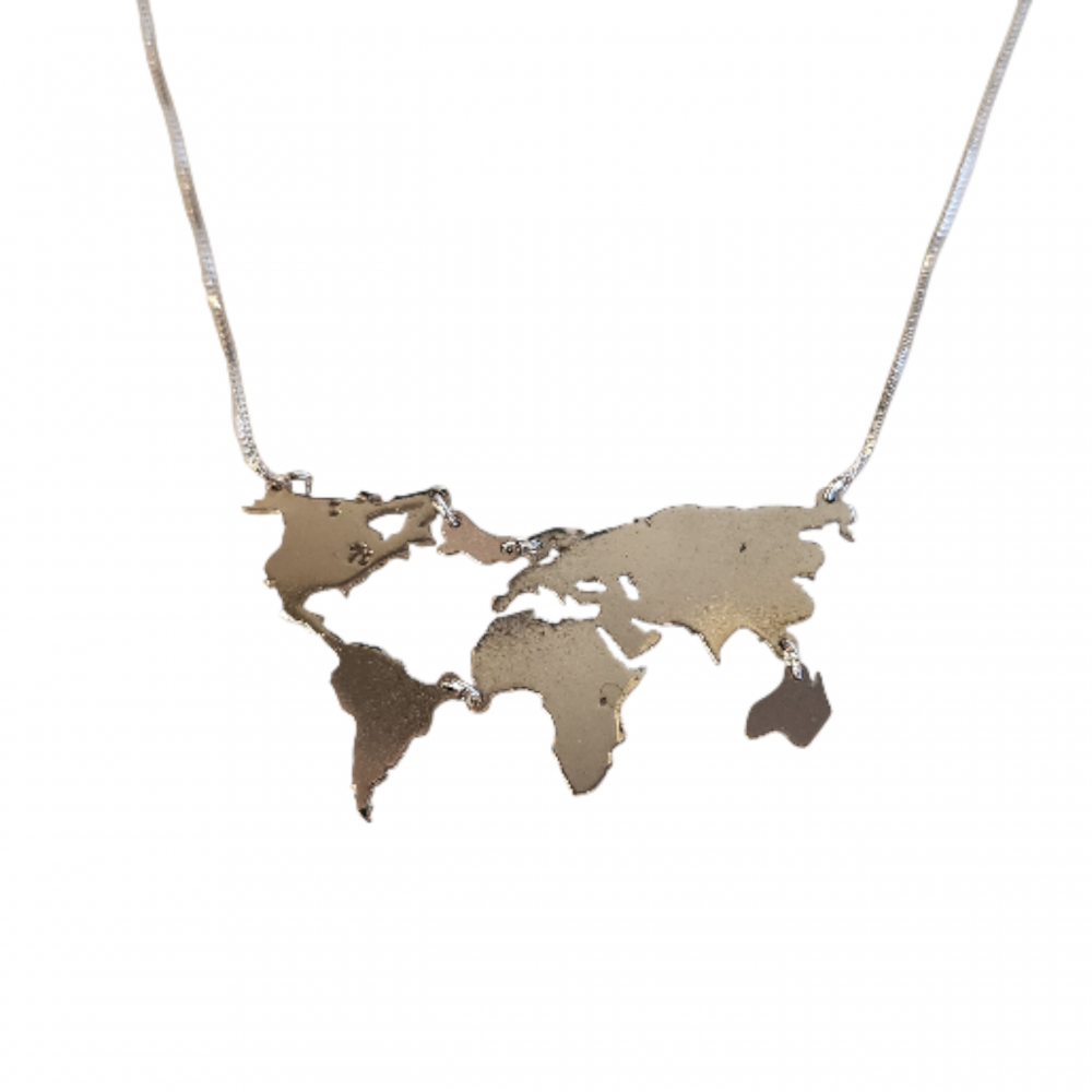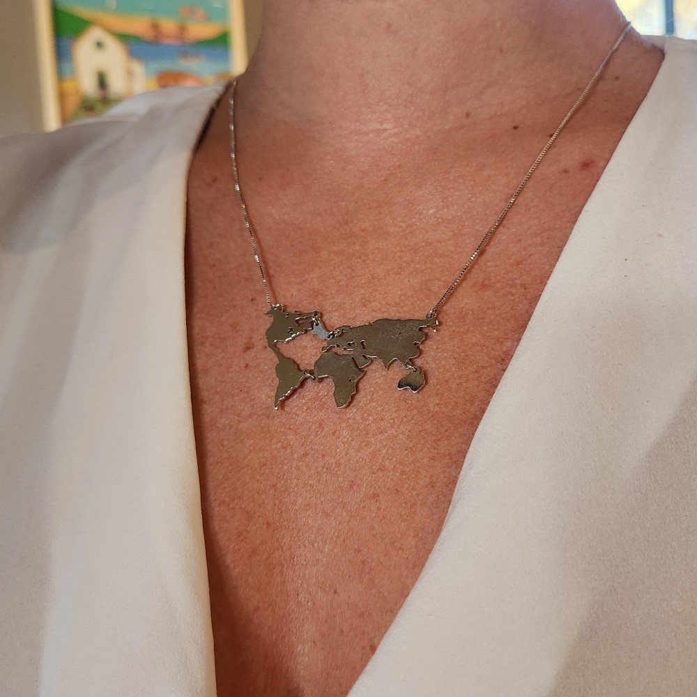 Colar mapa mundial articulado. Colar 45 cm de comprimento e pingente 3 cm x 6 cm. Banho em ródio branco. Material antialérgico e garantia de 1 ano.
