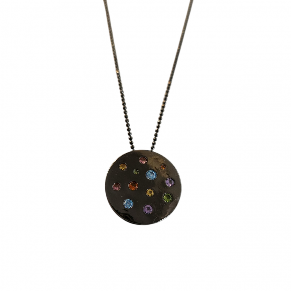 Colar pontinhos, comprimento 50 cm + 5 cm extensor. Medalha 2,3 cm. Banho de ródio negro com zirconias coloridas cravejadas. Material antialérgico e garantia de 1 ano.