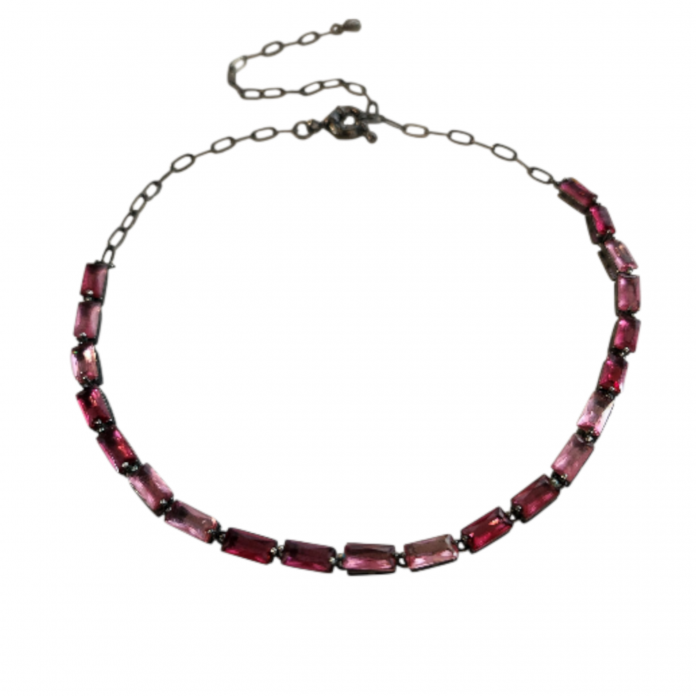 Comprimento 45 cm. Folheado em ródio negro com cristais rubi. Material antialérgico e garantia de 1 ano.