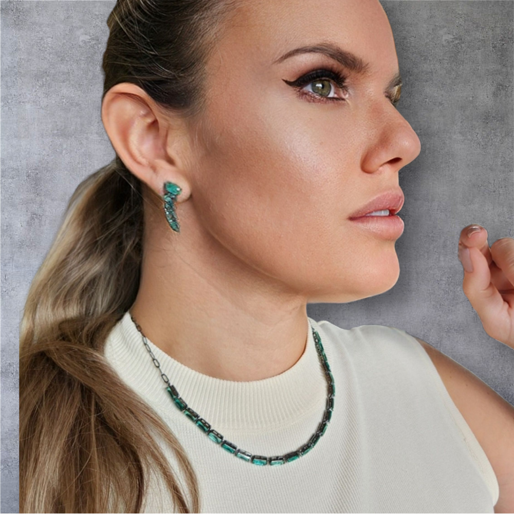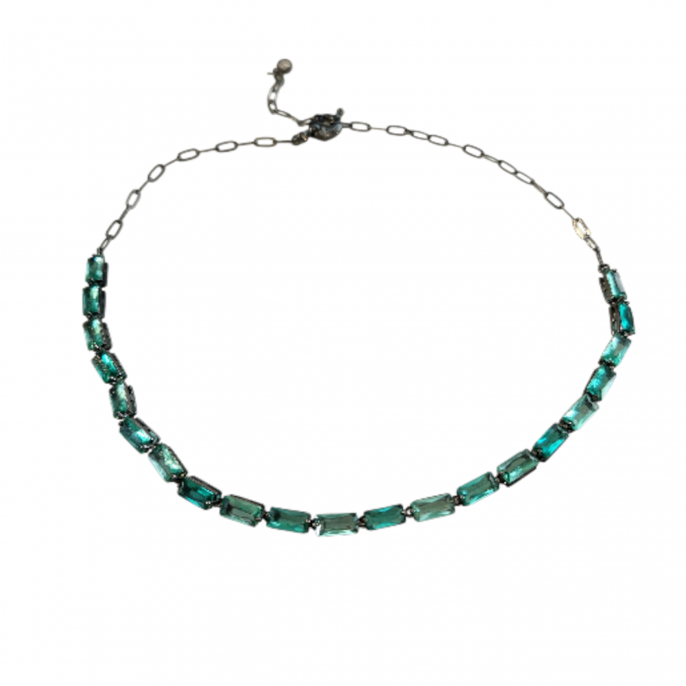 Comprimento 45 cm. Folheado em ródio negro com cristais esmeralda. Material antialérgico e garantia de 1 ano.