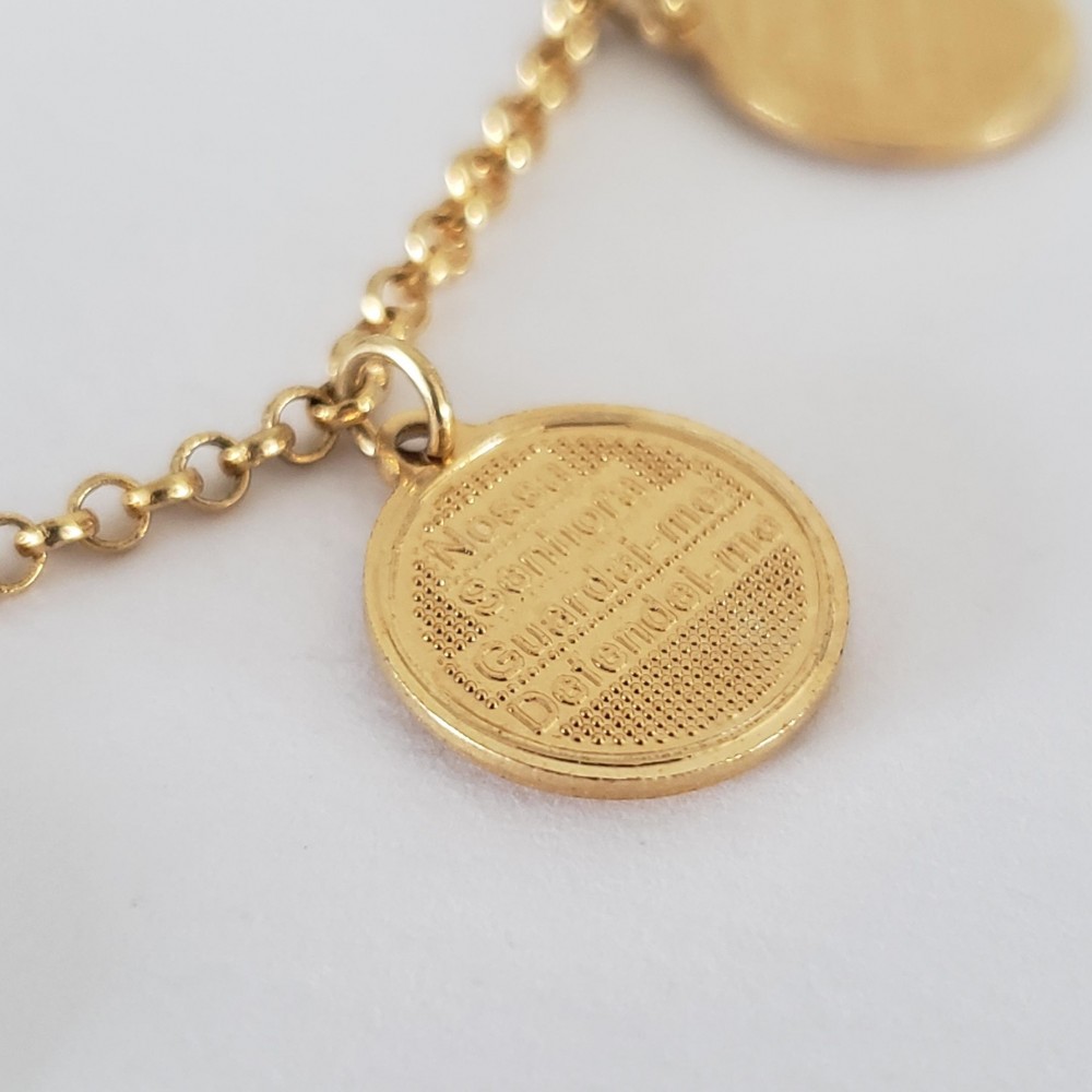 Um lado da medalha está a imagem de Nossa Senhora e o outro lado está escrito: Nossa Senhora Guardai-me, Defendei-me.